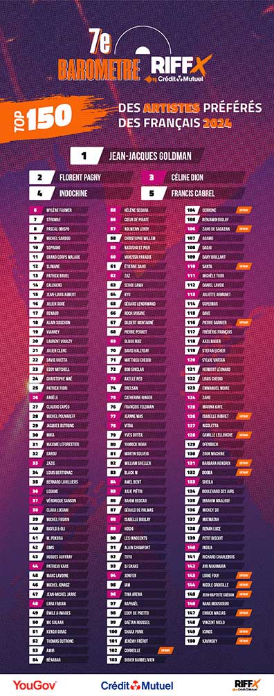 Pour la 6e fois, Jean-Jacques Goldman s’impose en tête du classement, Florent Pagny et Céline Dion grimpent respectivement sur la deuxième et la troisième place du classement. Indochine, Francis Cabrel, Mylène Farmer, Stromaé, Pascal Obispo, Michel Sardou et Soprano complètent le Top 10. Il est important de noter qu’en région parisienne, c'est Florent Pagny qui remporte le classement devançant Jean-Jacques Goldman.